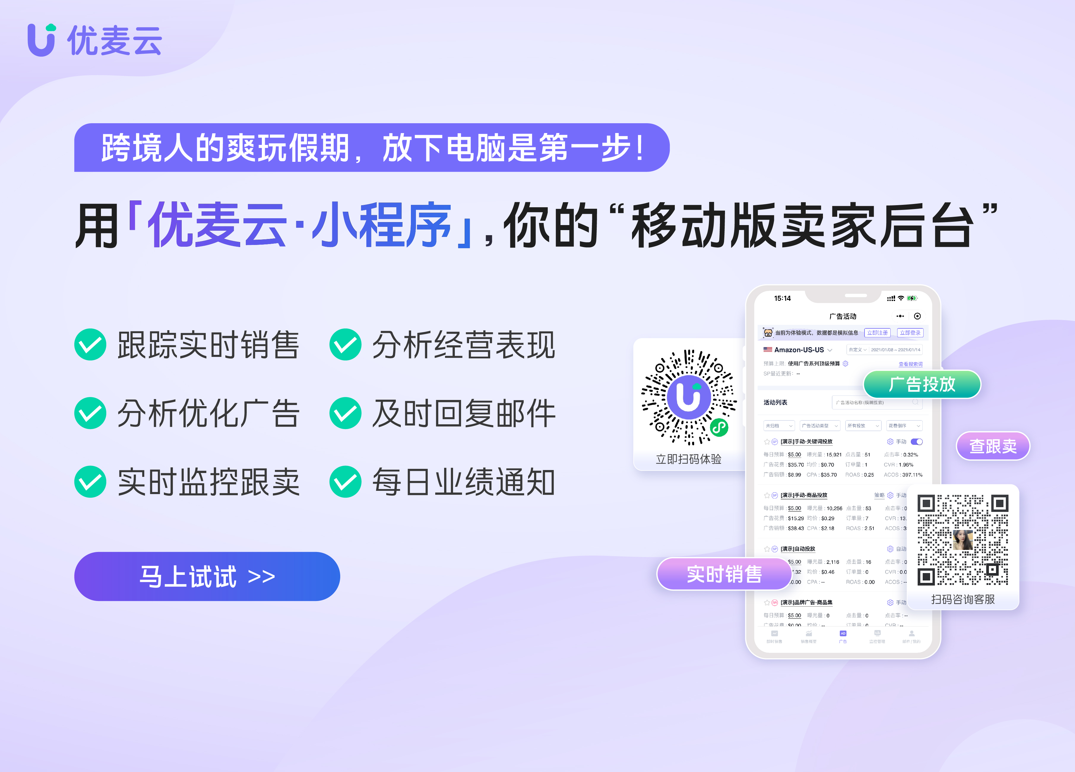 今天,优优要为你正式介绍一位“移动店铺管家” —— 优麦云·小程序。 你只需要一部手机,就可以直接看销量、调广告、回邮件、看跟卖…… 店铺情况,一查便知,随时修改。它不仅是你的“手机版卖家后台”,更是让你随时随地、轻装上阵的“智慧运营助手”!