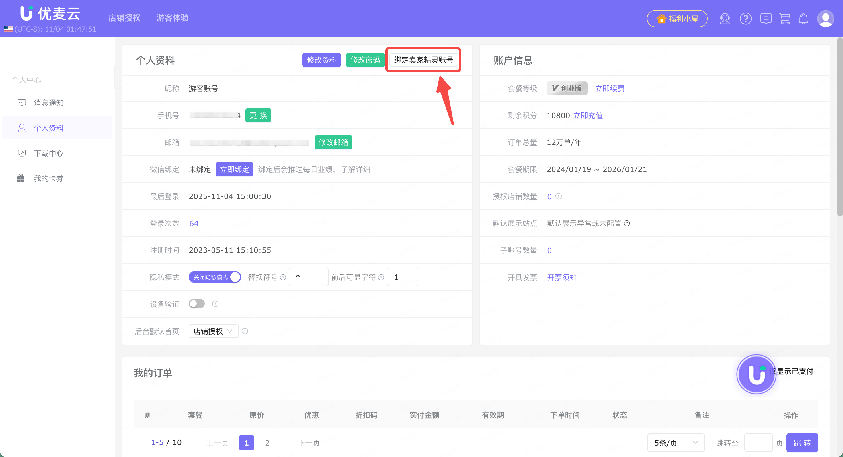 进入优麦云【个人资料】中心,点击上方的【绑定卖家精灵账号】,进入绑定验证页面。